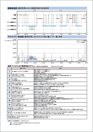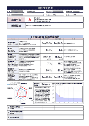 検査結果は、スリープスコープを持ってご来院いただいた日より、さらに1週間後にお知らせいたします。 お渡しの際に、医師より検査結果をもとに説明や今後の改善に向けてのアドバイスをいたします。 検査結果には、AからCまでの3段階の総合判定以外に、「総就床時間」「寝つき」「熟眠度」「中途覚醒」「睡眠効率」「睡眠リズム」の6項目をそれぞれ5段階で評価するチャートや睡眠時の脳波を年齢で評価する「睡眠時脳波年齢」を掲載し分かりやすく解説します。