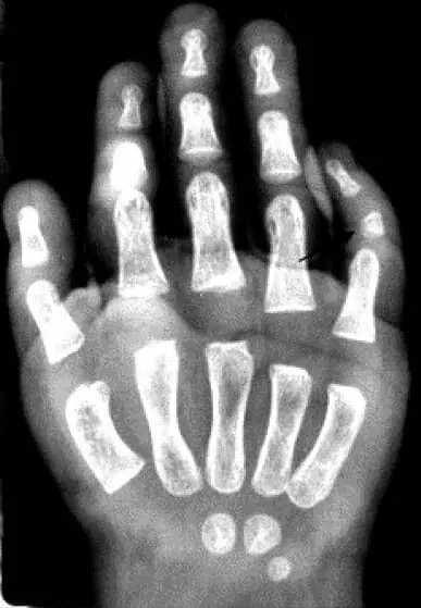 | 46, XX, del (12) (q24.31) | Baple et al. (7) | 13歳、不正咬合、過成長、高インスリン血症、発達遅延(1歳半で歩行、2歳で数語使用可能)、著明な不安症、自閉症スペクトラム障害、中等度から重度の知的障害、口蓋裂、広い鼻底、膨らんだ頬、高度にアーチした口蓋。手足が大きく、指は軽度の先細りで、足指は短く、左第4指は近位に埋没し、第4中手骨は短縮している。 |