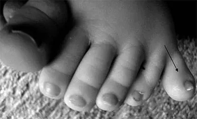 現在、24か月時点で、患者は発育不全、体重10.6kg(5パーセンタイル値)、長さ78cm(5パーセンタイル値未満)、OFC 48cm(50パーセンタイル値)を呈している。 身体的特徴は、大きな前泉門および顔面外観のわずかな粗大化に対して有意であった。 鼻は短く、前捻鼻孔と滑らかな菌糸を有していた(図1-A)。 耳は正常に設定され、大きさおよび形状は正常であった。 口蓋は厚いガムで狭かった。 患者はまた、左足に第5指の斜指と多指症を呈した(図1-B、C)。