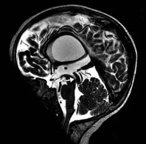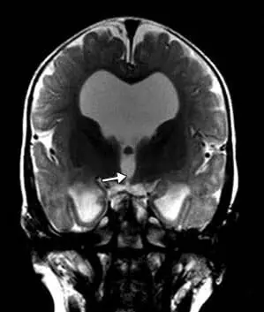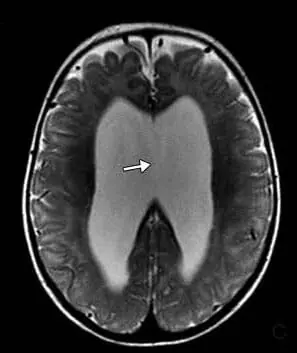 頭部磁気共鳴映像法では、テント上水頭症、視交叉陥凹のバルーニング、薄い脳梁、側脳室および第3脳室の拡張、透明中隔の欠如、および脳の低髄鞘化が明らかになった(図2)。