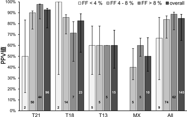 全体として、サンプルの2.0%(264 / 13,509)の胎児の割合は4%未満、サンプルの43.9%(5933 / 13,509)の胎児の割合は4〜8%、サンプルの54.1%(7312 / 13,509)の胎児の割合は8%を超える胎児の割合。胎児の割合による高リスクNIPTの結果の内訳を図3に示します。見てわかるように、高リスクの症例の大部分は4〜8%(49.5%; 93/188)の胎児の割合でした。胎児の割合が4%未満の264のサンプルのうち、21はNIPTによってハイリスクとして分類されました(6トリソミー21、6トリソミー18、および9トリソミー13)。これらの21症例のうち9症例で結果が得られ、PPVは66.7%でした( 6/9)。低リスクの症例では、胎児の割合が4%未満の症例で98.1%(52/53)のNPVが観察されました。胎児の割合が4〜8%の場合(1198/1198)、および胎児の割合が8%以上の場合(1227/1227)に、99.9%を超えるNPVが観察されました。