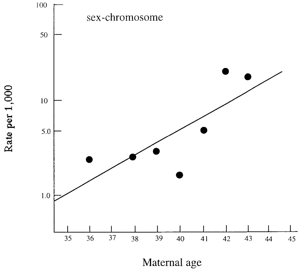 3 染色体异常(XXY、XXX、XYY)的百分比 (纵向) 和母亲的年龄 (横向)