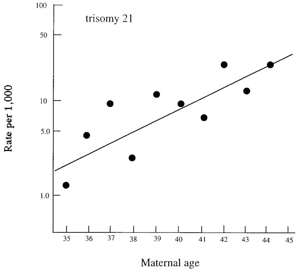 图1 21号染色体三体的百分比 (每1000个胎儿) (纵向) 和母亲的年龄 (横向)
